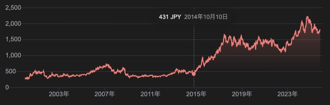 しかしその後、株価は右肩上がりとなり、2023年には2,100円超を記録。2025年時点でも1,800円台を維持しています。